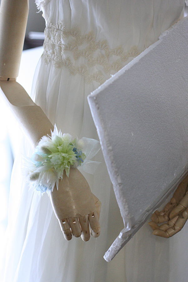 Bブーケを持って、且つ手首に小さめに花を飾る場合を、