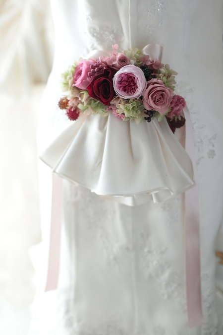ドレスの腰くらい、後ろにつける花をバックコサージュと呼びます。