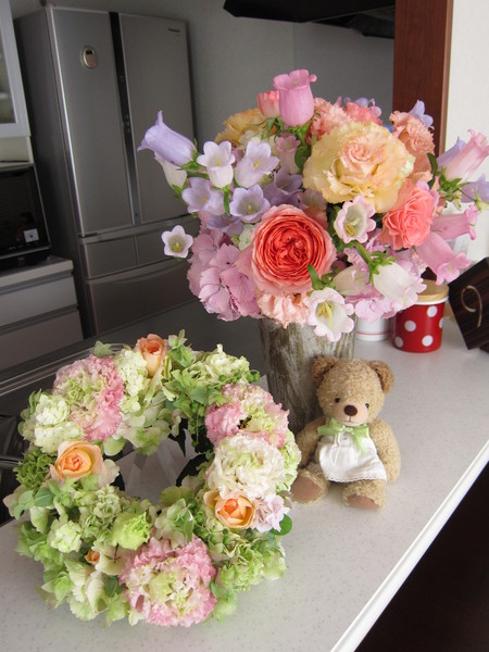 小さめの花をリースにして、省スペース。