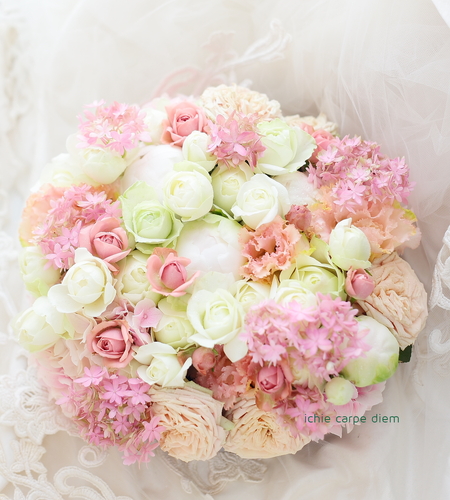 挙式のブーケの時の白の芍薬と白の丸いバラ、
