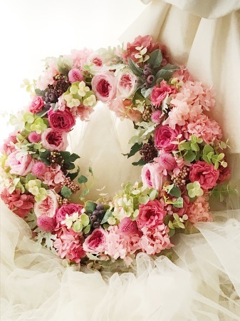 プリザーブドのバラのリース、ピンクとグリーンで。