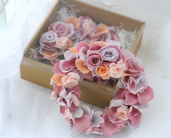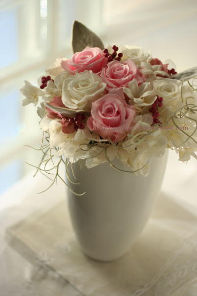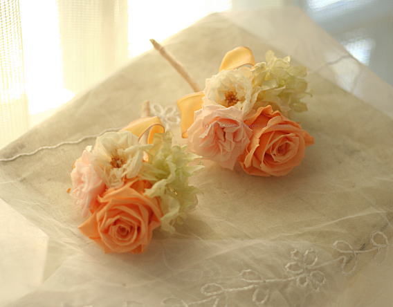 写真は、ご両親贈呈用の花として製作したプリザーブドフラワーのいろいろ。