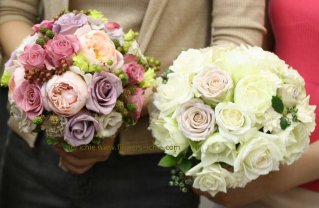 ウエディングドレスとホワイトロマンスとブルゴーニュのブーケ。