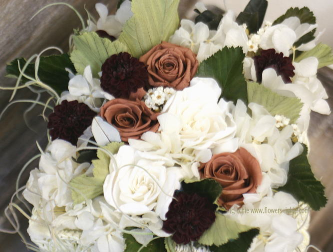 白にボルドーのダリアがきいています。中央の花はちょっと見えにくいですが