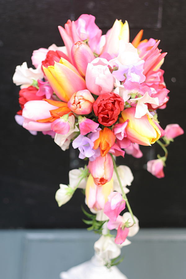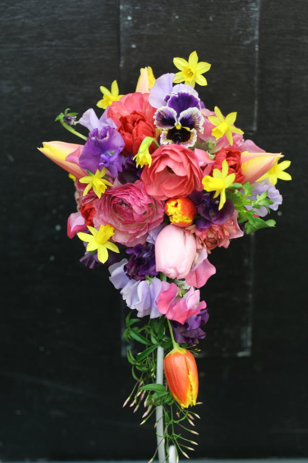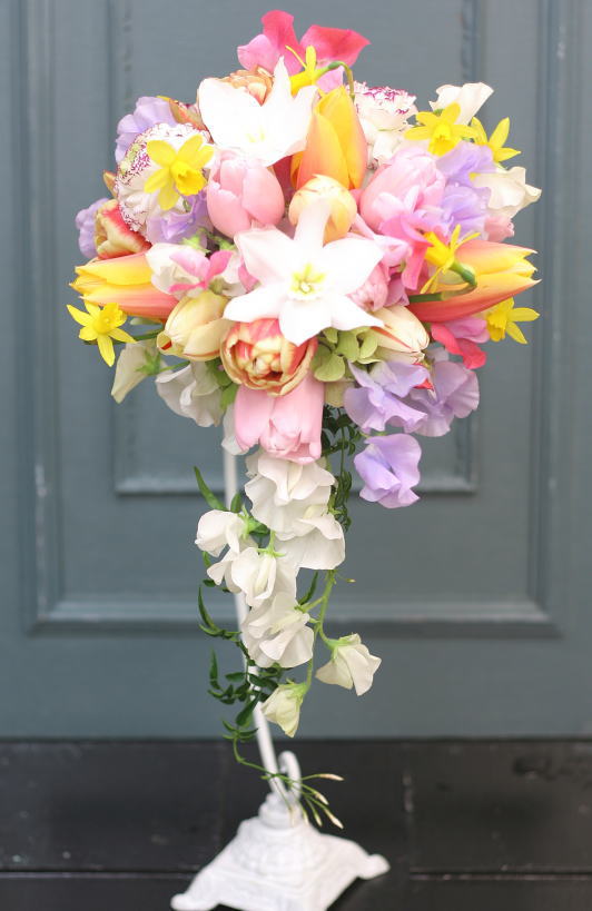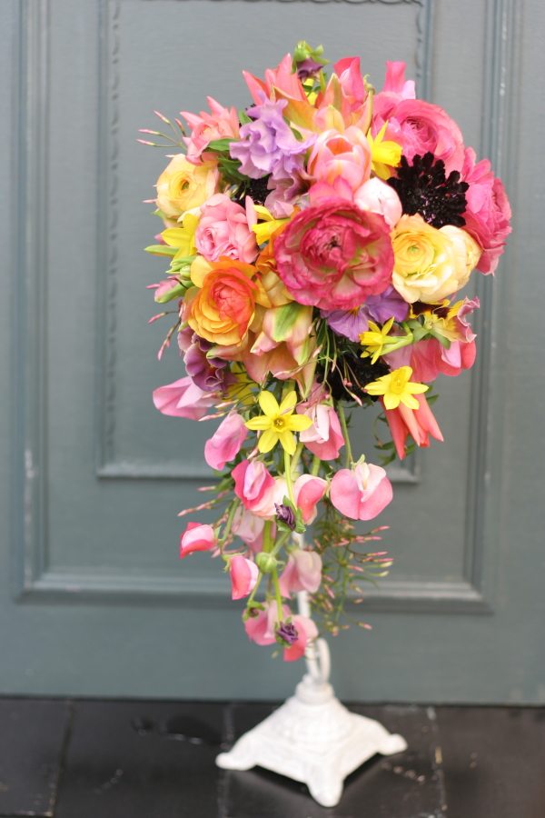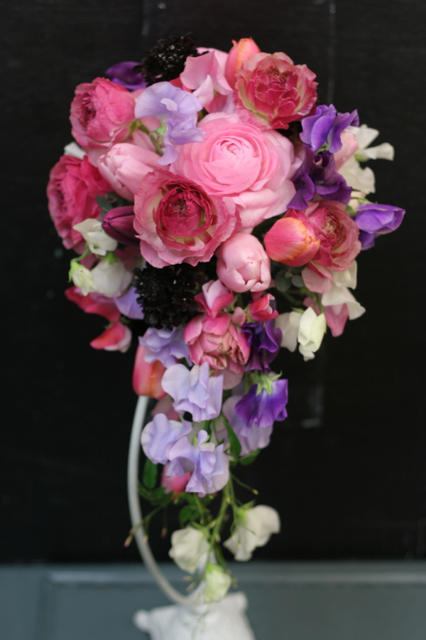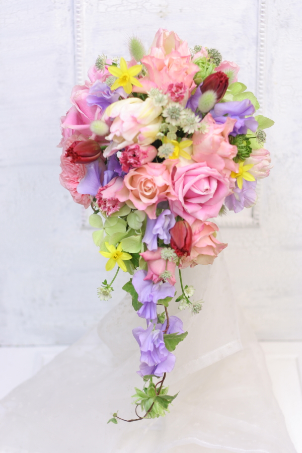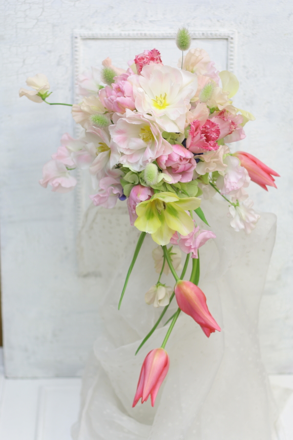 チューリップもしくはラナンキュラスのセミキャスケードブーケ。