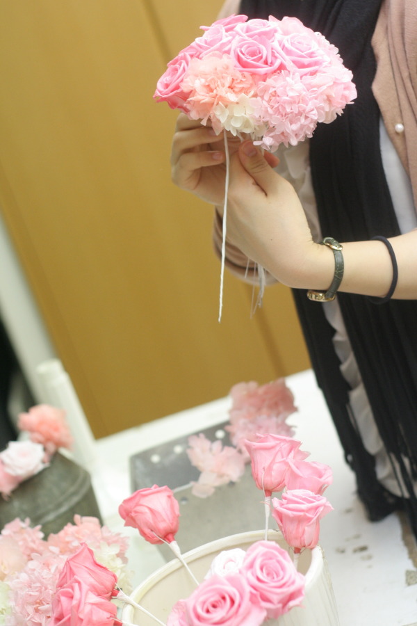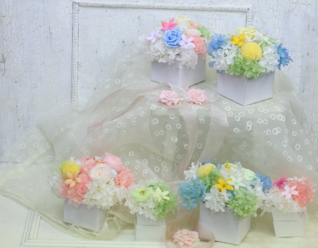 アレンジ6個と受付のお友達へ差し上げるリストレット3つ。