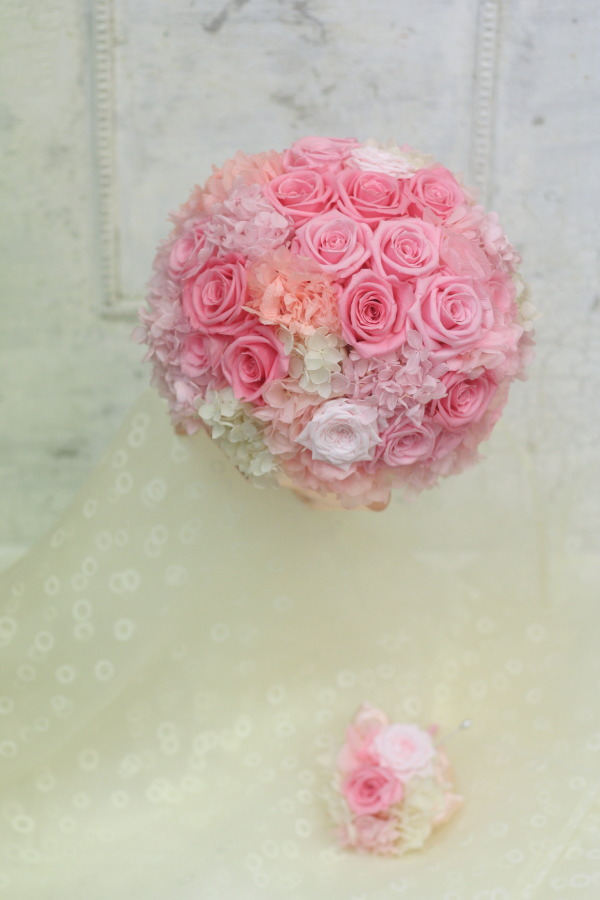 ころんとしたピンクのラウンドブーケ、ご新郎様に