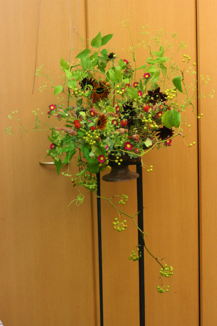 アスターの赤とひまわりの黒、いろんな花材がある中で