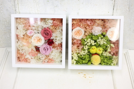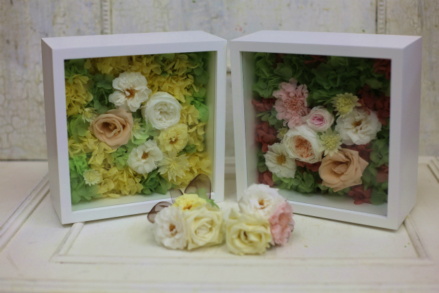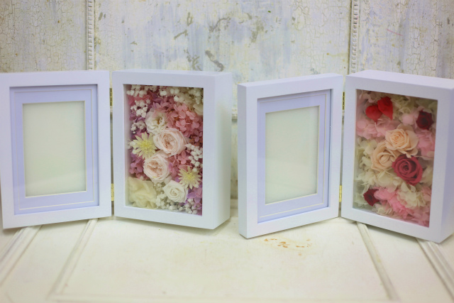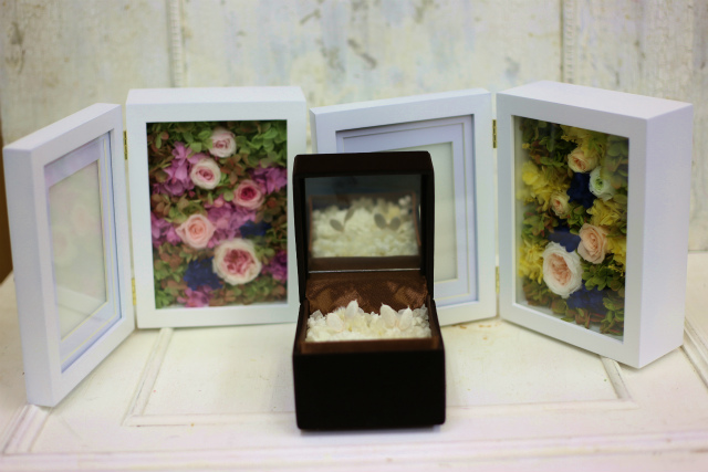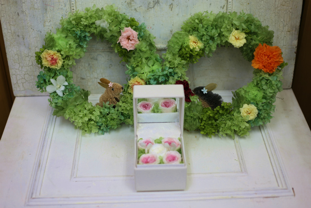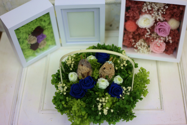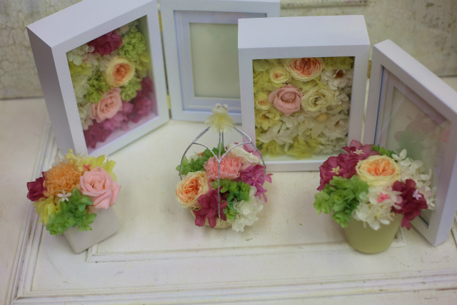 一番手は、お二人でいらして贈呈用のフレームとミニアレンジ3つ。