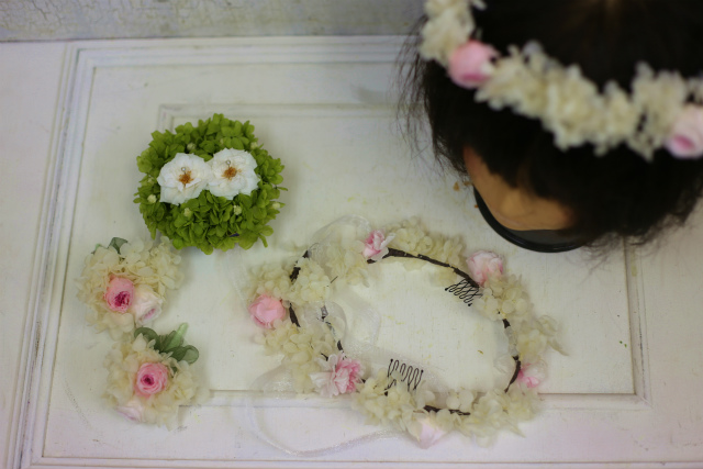ガールクラウンふたつと、リングボーイ用コサージュと、リングピローまで