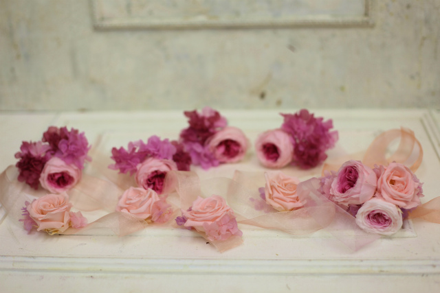 ご友人の髪飾り×4つ、リストレット×4つ、自分用のリストブーケ×1つ、