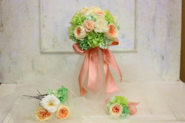 おひとりでサポート付で、ブーケとブートニアとヘッドドレス。