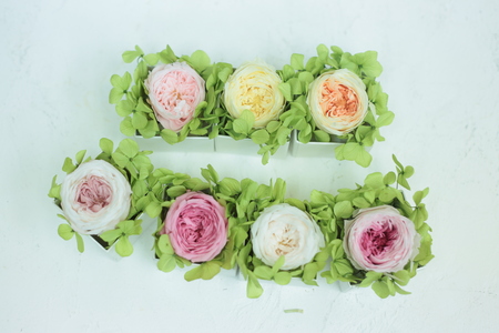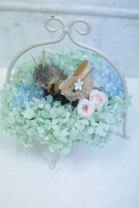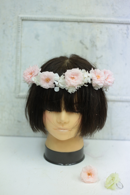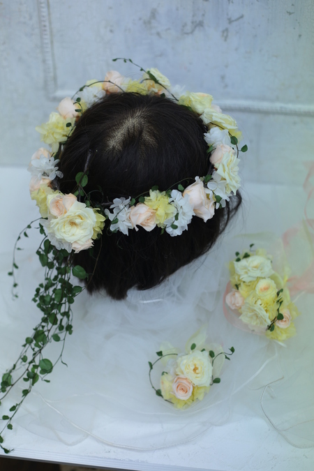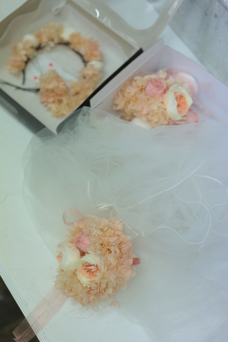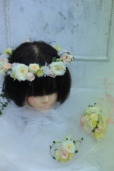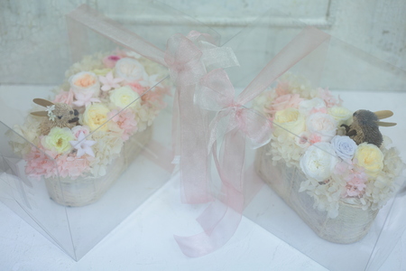 御両親贈呈用のかごアレンジ、花冠。リストレットを製作。