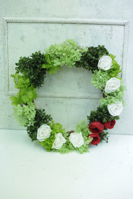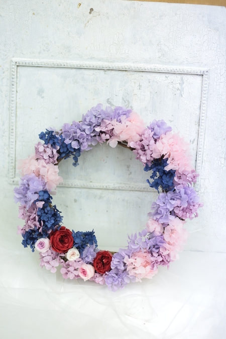 リース、リリメリアのブーケ、席に置くミニアレンジ。