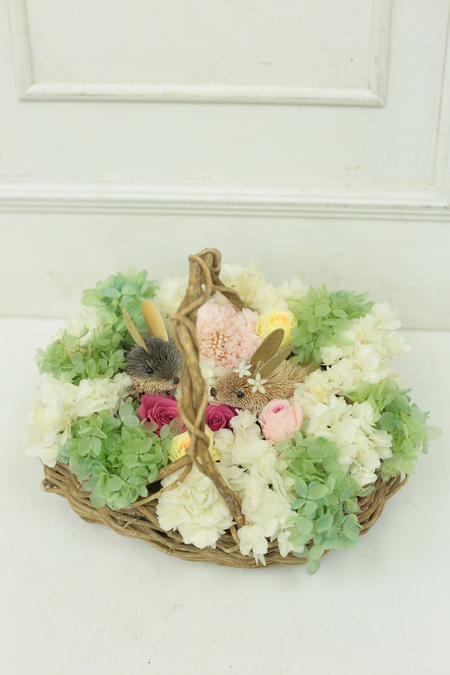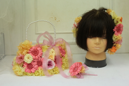 花嫁様の手作りブーケ。リボン型のバッグブーケとヘッドドレスの花鎖、そしてブートニアをわずか2時間あまりで作っていかれました。