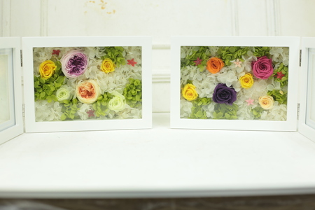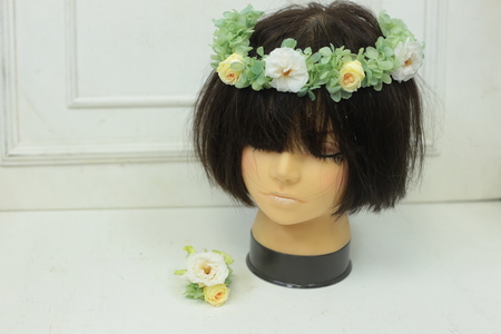 お二人で参加されて贈呈用フォトフレーム2つ、花冠、ブートニア