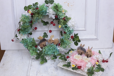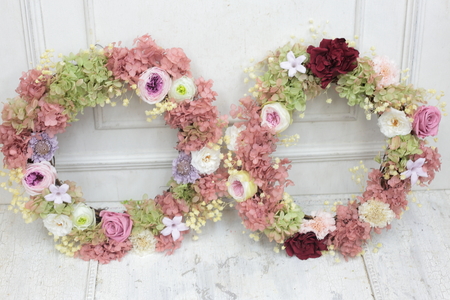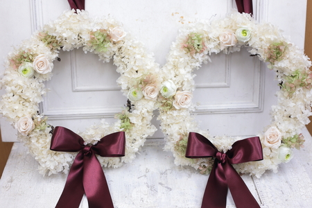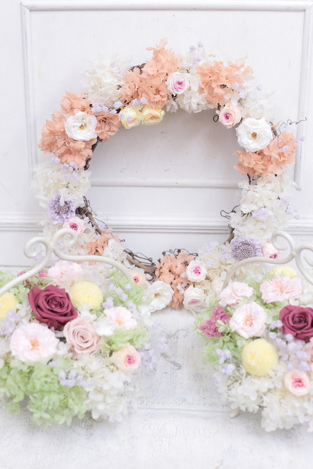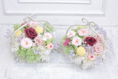 とても仲良しのお二人は、受付テーブルの両端に飾るアレンジと