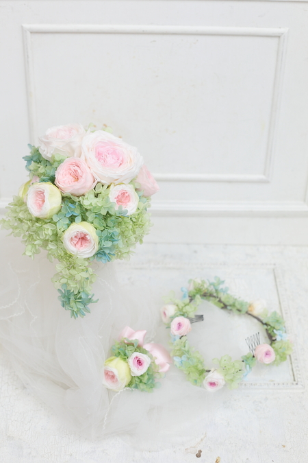 ブーケと花冠とブートニア、選ばれた色合いがとても素敵です。