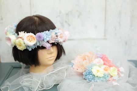 お花たっぷりの花冠と、ドレスの腰に飾る花まで
