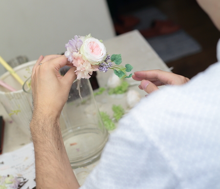 冒頭のお二人のご新郎様がブートニアを作ってらした様子。