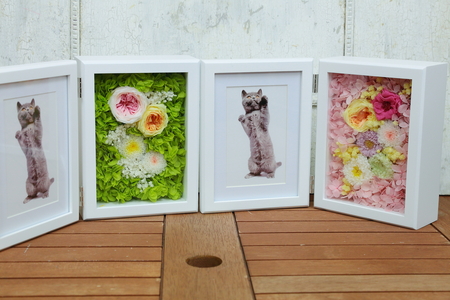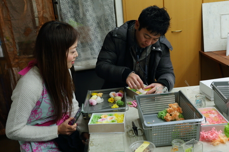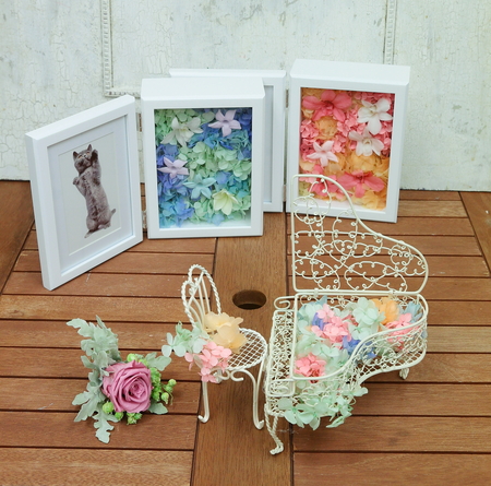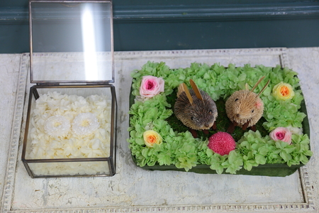 まずアジサイを選び、しきつめ、次に慎重に花を選んで、力作。