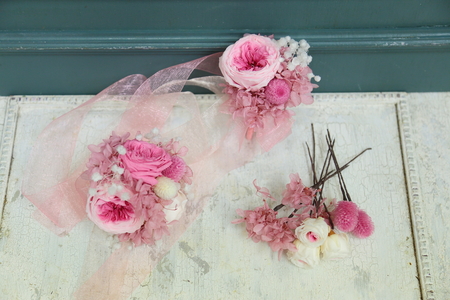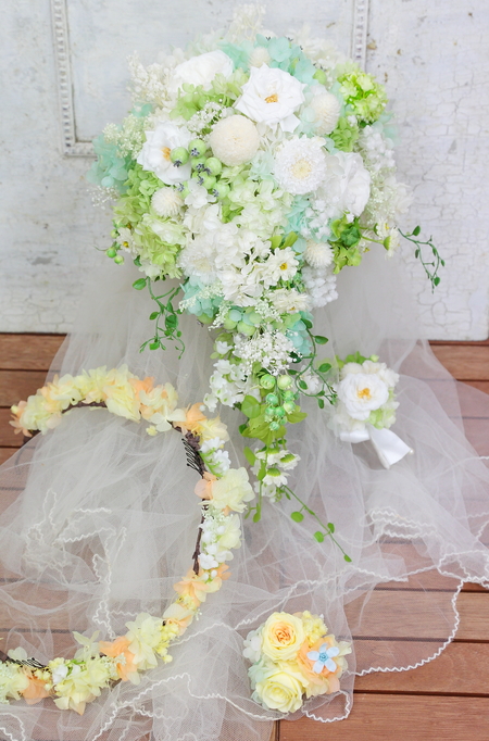 こちらはリストレットとブートニア、髪飾りのお色直しセット。