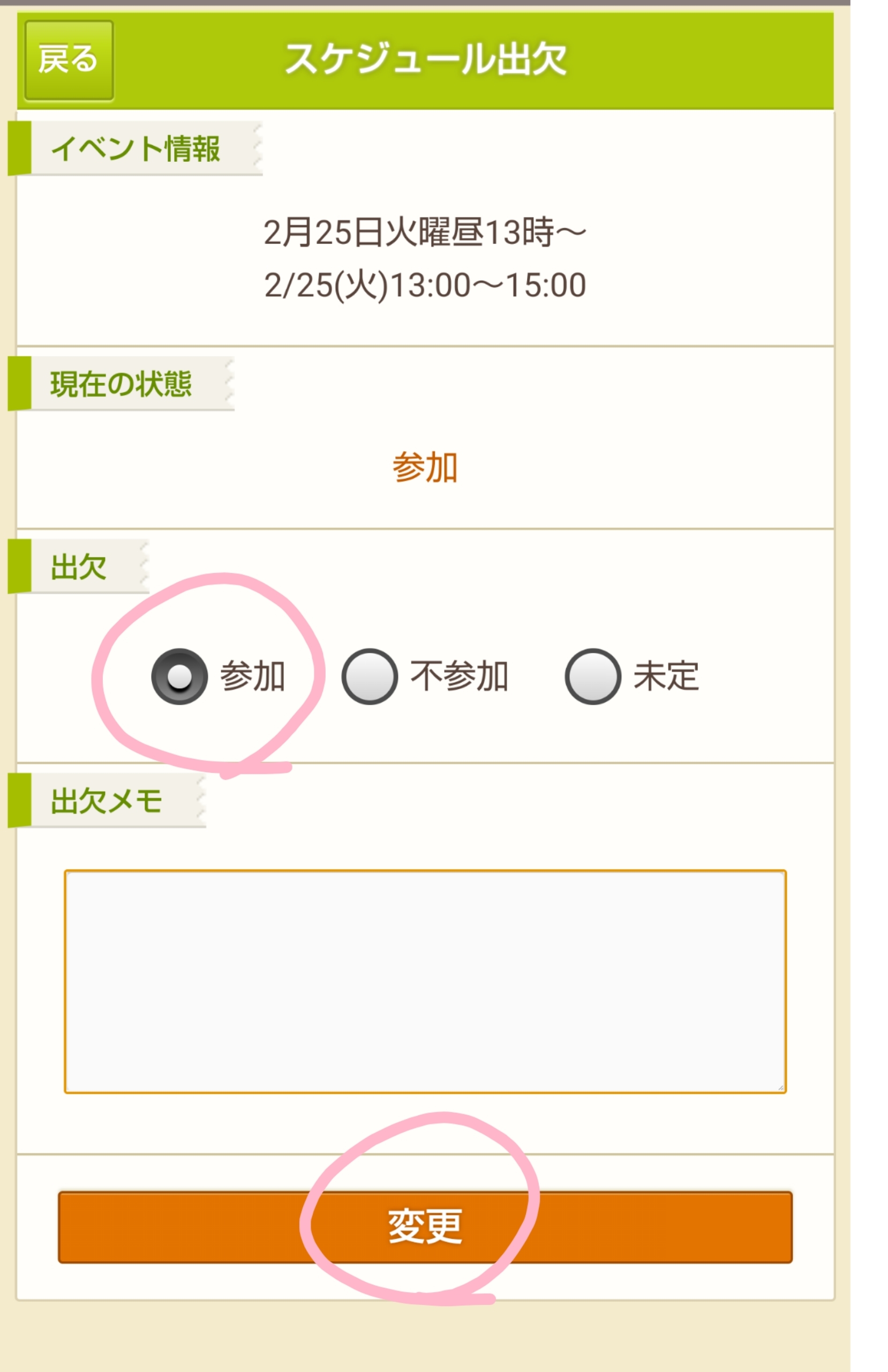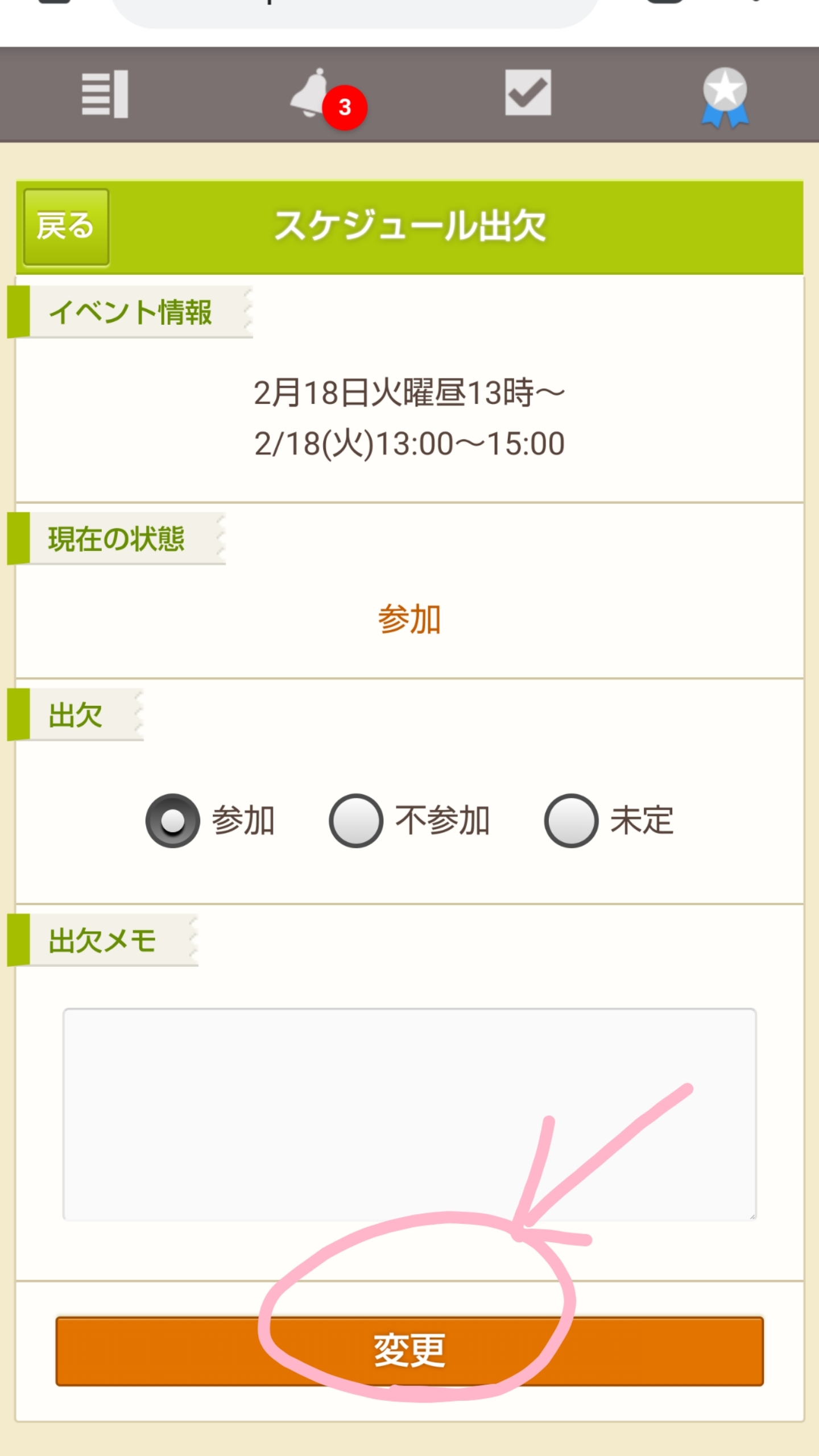 出欠が「参加」になっていることを確認して【変更】で登録完了です。