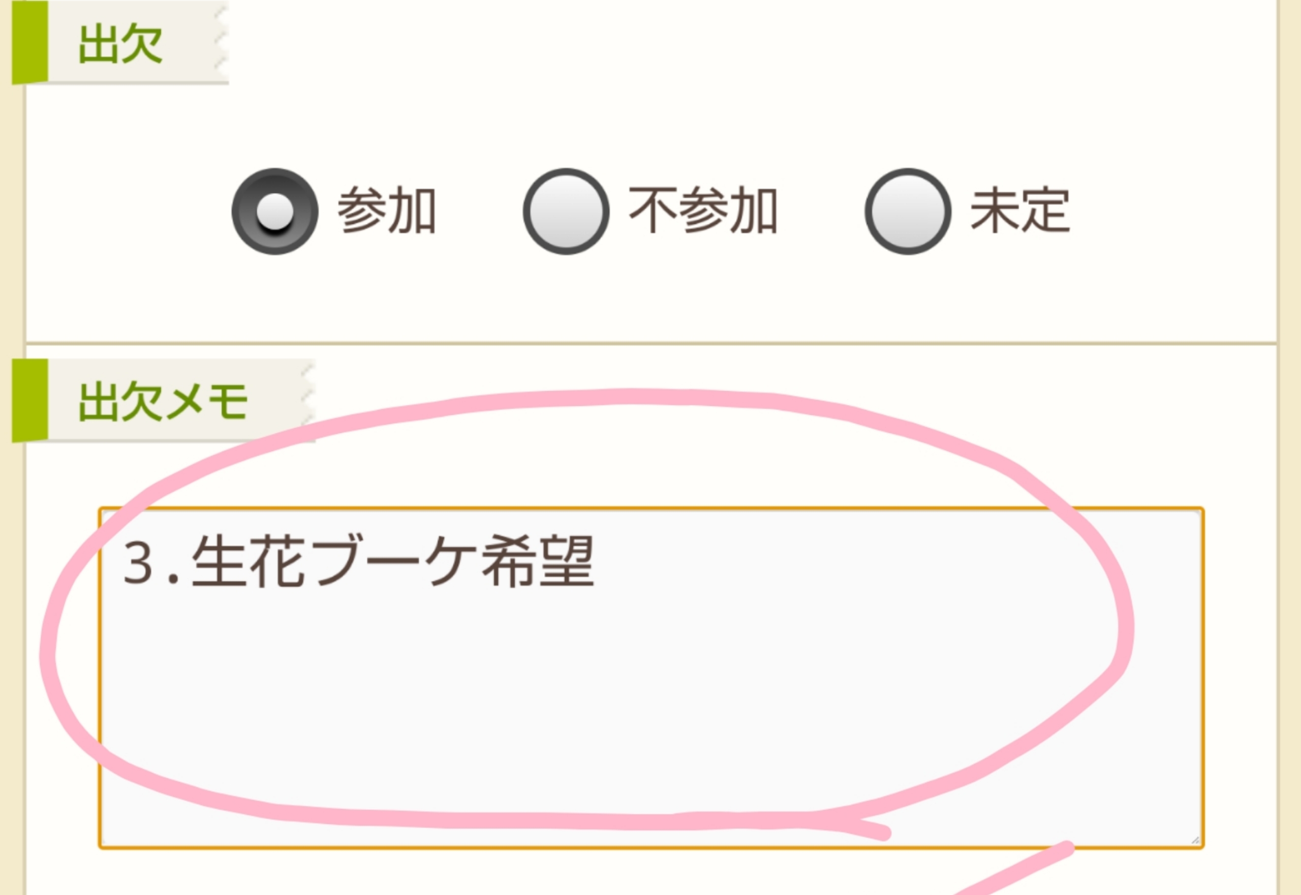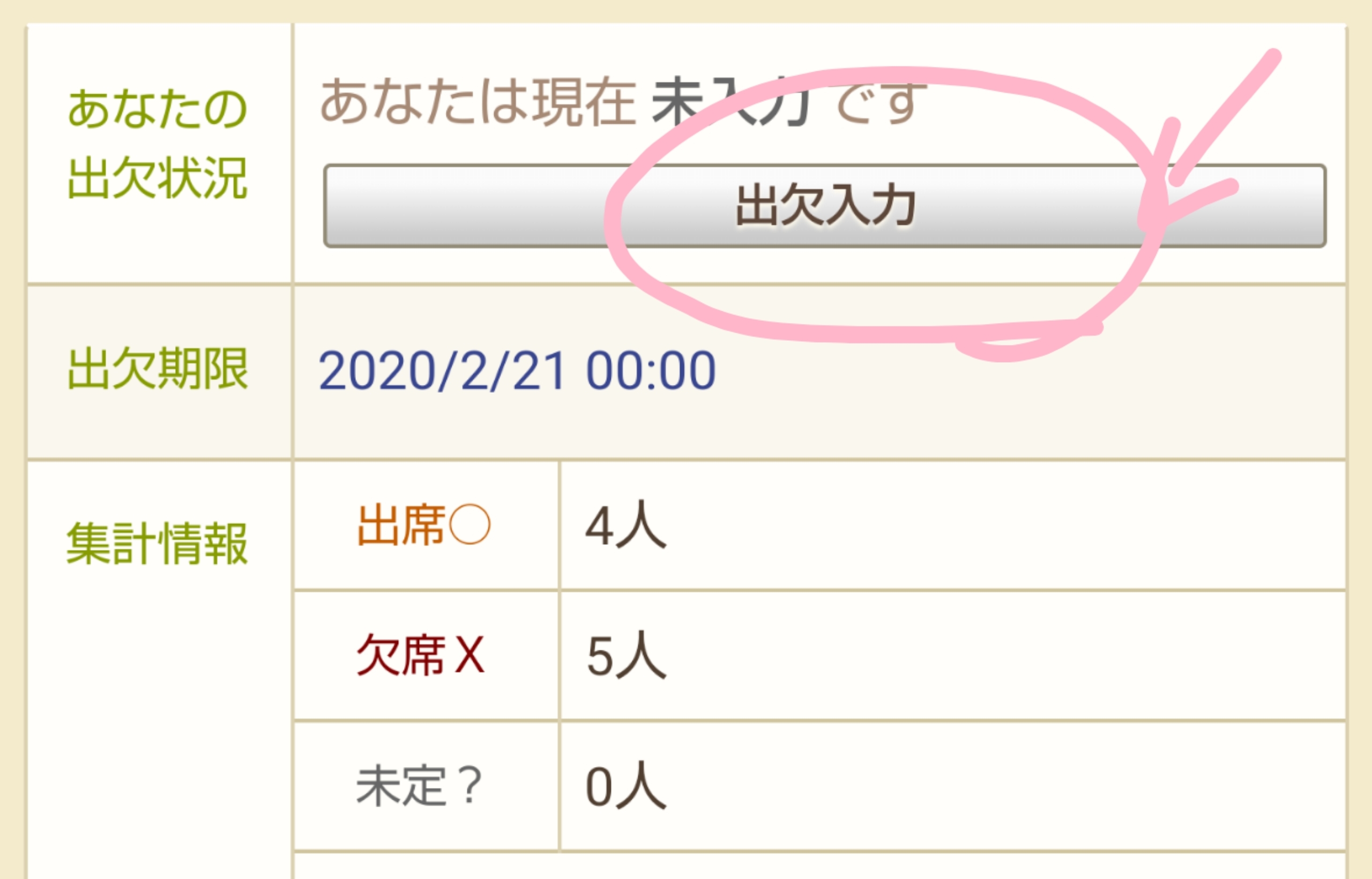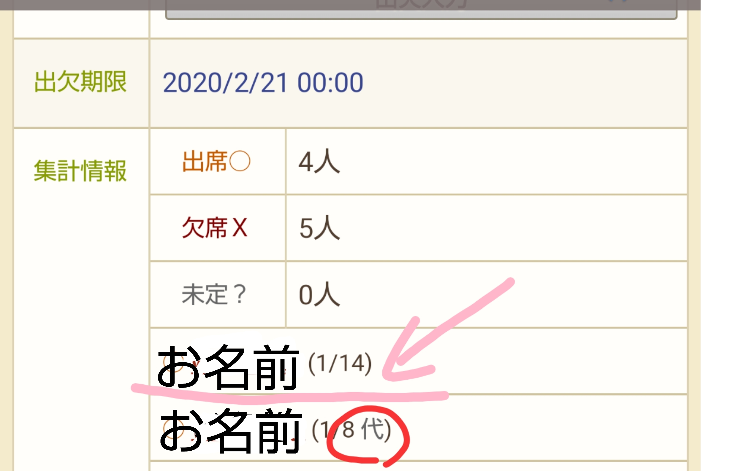 出欠メモは集計の際に同じ画面に表示されるので助かります! つぶやきは埋もれてしまうと探すのが大変なのです・・・すいません。