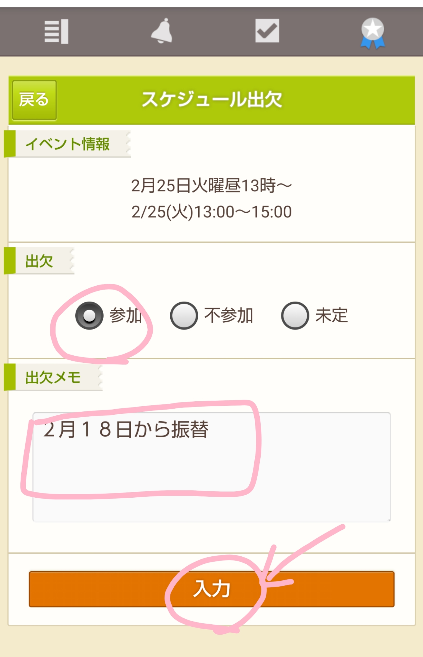 出欠メモに振替希望日を入れただけではお席の確保ができません! 必ず次の手順で出席したい日程に「参加」の入力をしてくださいね。