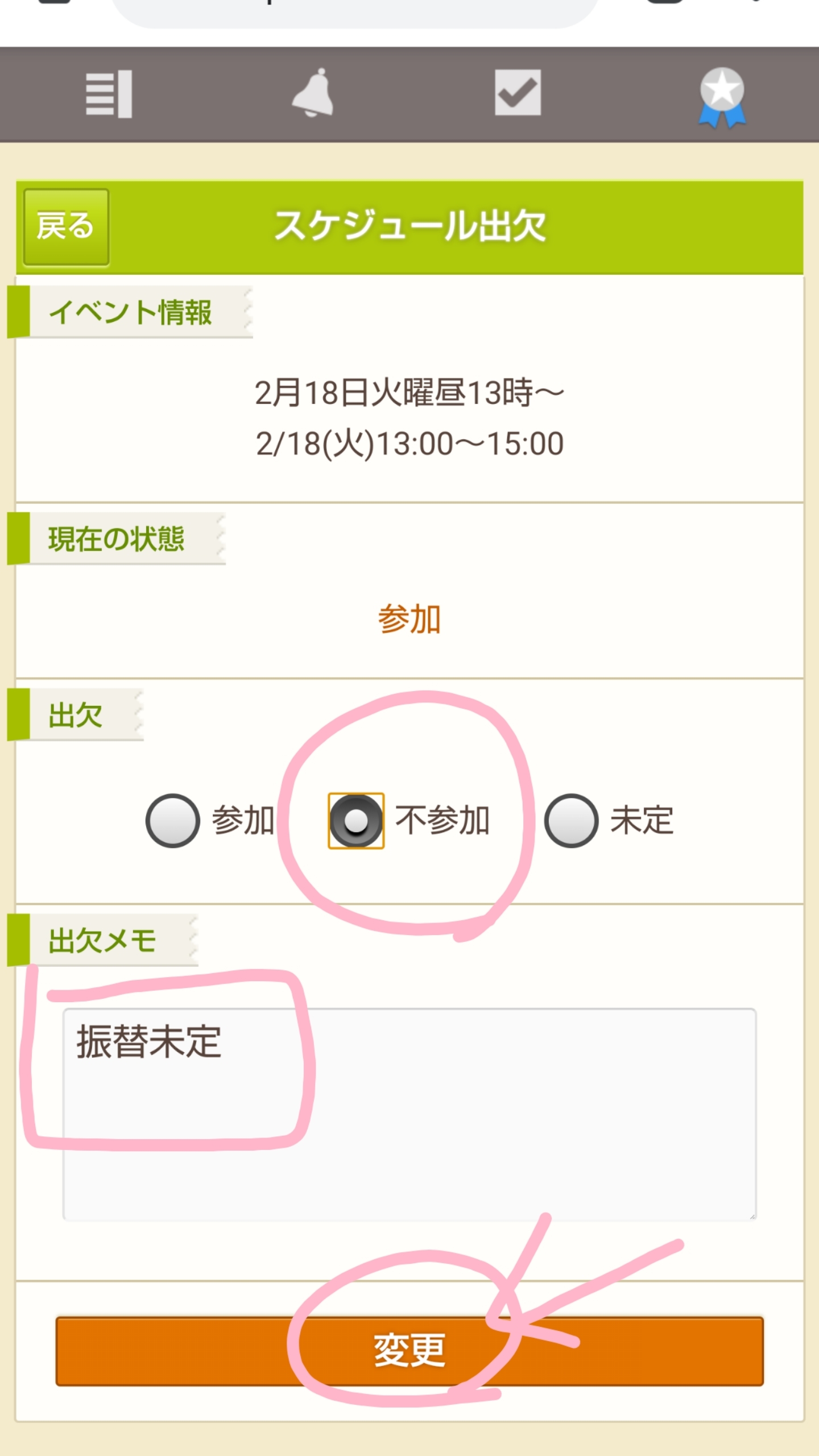 出欠を「不参加」にして出欠メモには振替未定と入力して【変更】で登録完了です。