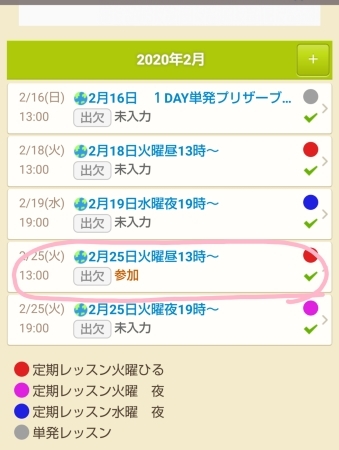 レッスン内容が選択制で希望を入力する場合は このページの出欠メモに希望を入力してください。