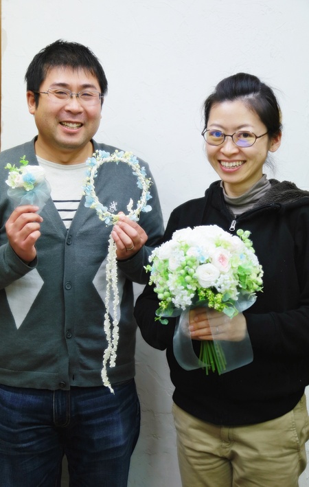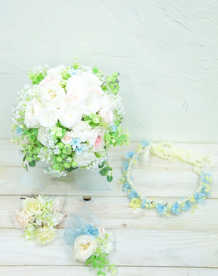 半日で贈呈用アレンジ×2、花冠、ブーケブートニアヘッドドレスまで