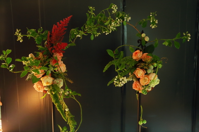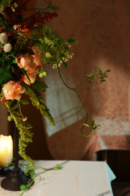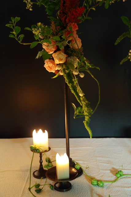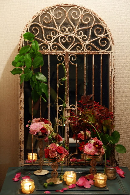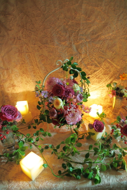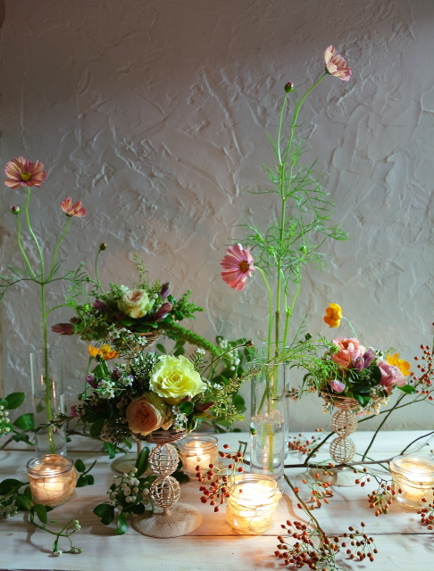 そのスペースにあわせて器とキャンドルと花を選んで、