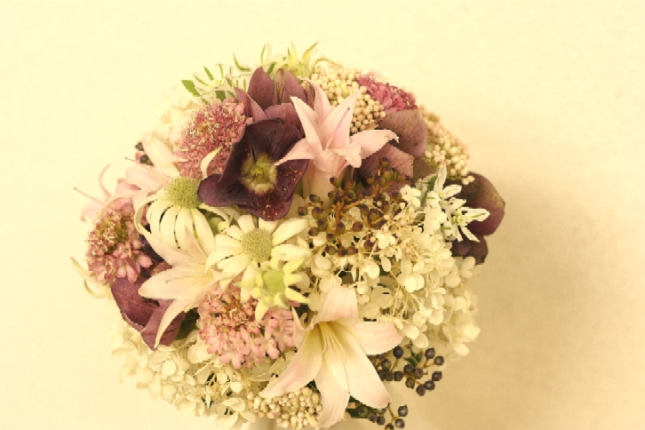 下の写真は彼女自身が、一会のレッスンで製作したブーケ。