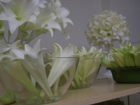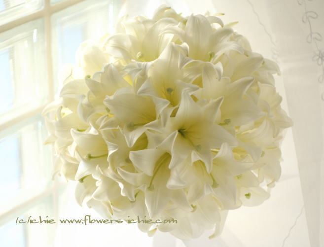 鉄砲ユリのみで丸い真珠のように作り上げたブーケは