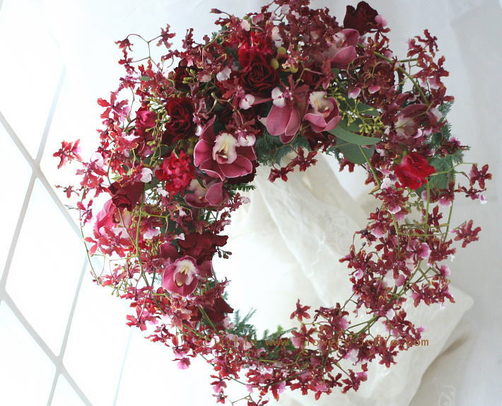 赤いドレスにあわせて仕立てた甘い香りの蘭とバラ。