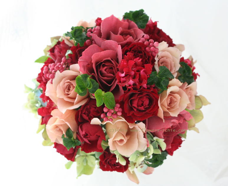 明るい赤と静かな赤を、ひとつのブーケにしています。