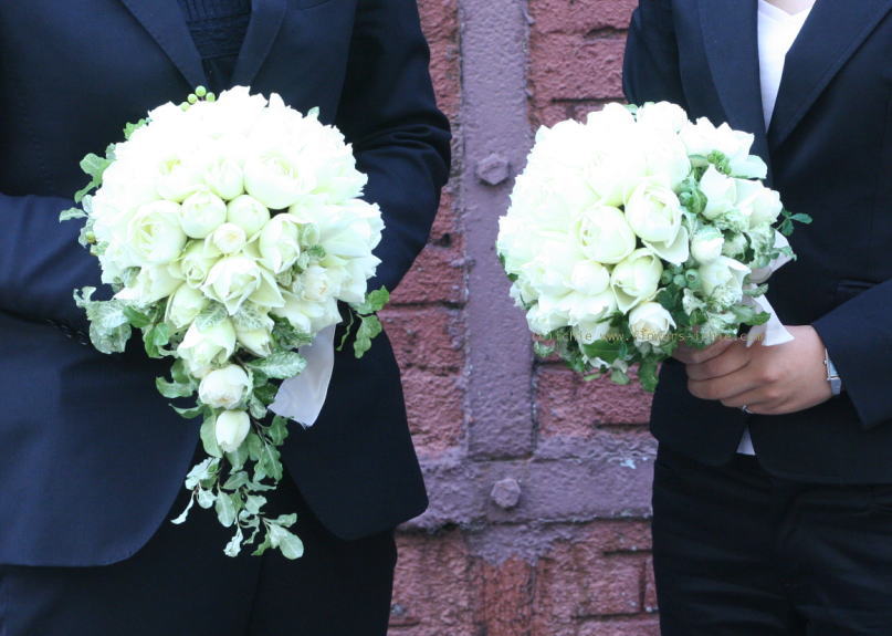 同じ、ころんとした丸いバラで作った白いブーケ。