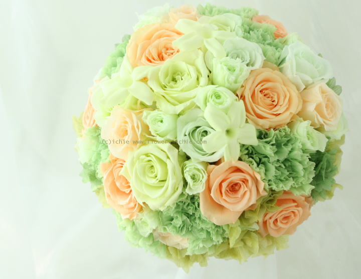 プリザーブドフラワーで作る、オレンジとグリーンのラウンドブーケ。