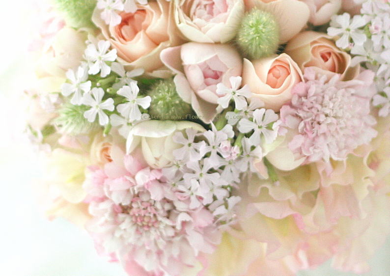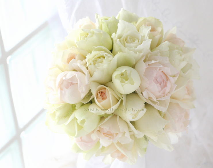 白のバラのブーケはほんのりピンクがさしていて、なんとも素敵な