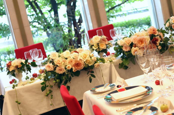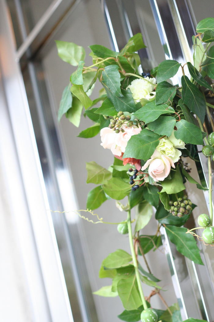 会場のお花も担当させていただきました。フレームの先につるしたりんごは、