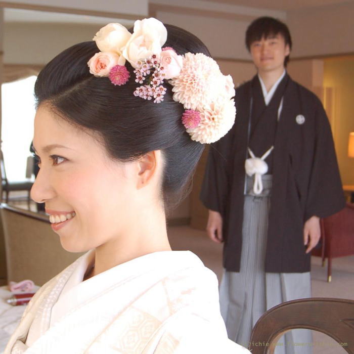 二次会のお写真です。新婦様のご要望により、和装時に使用されたヘッドドレスを二次会のヘッドドレスとしても使いたいとのことで、お花を御用意させていただきました。ご友人にもヘッドドレスをおすそ分けしてつけて頂いたそうで、「大成功☆」との新婦様のメールをいただき、一安心しました。