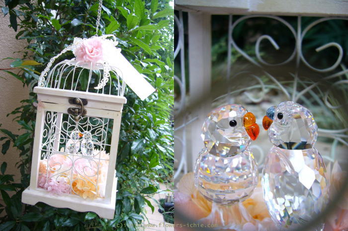 下のガラスの小鳥はウェルカムアイテムになっていて、プリザーブドフラワーを敷き詰めた鳥かごの中に2羽の小鳥がはいっています。