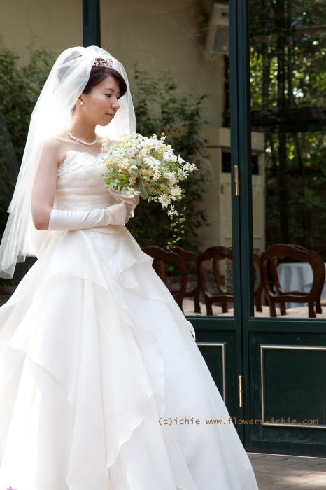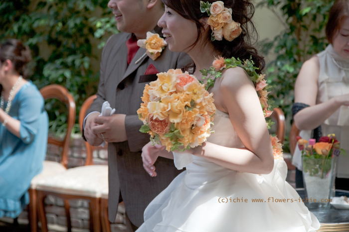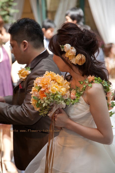 肩紐になるドレス飾りは造花の葉とプリザのセルリアで。