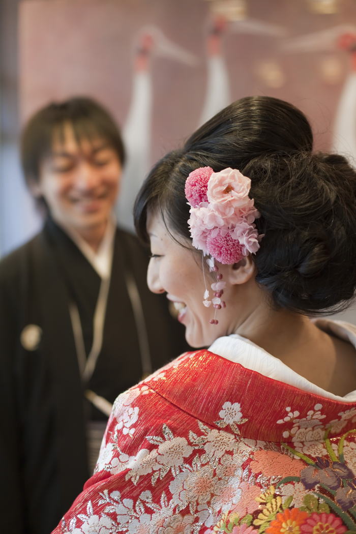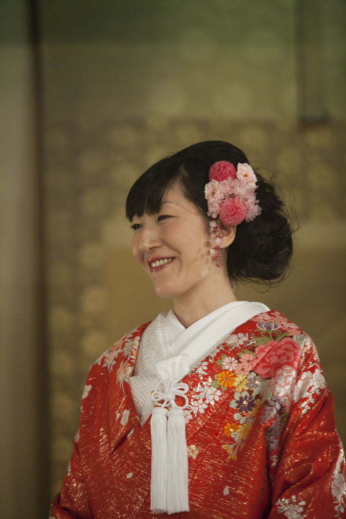 ブーケとおそろいの髪飾りを付けてもらい、披露宴用の色内掛けを着て、