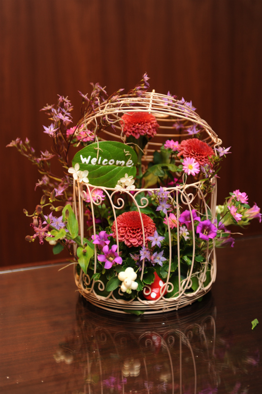 花の入った鳥かごも