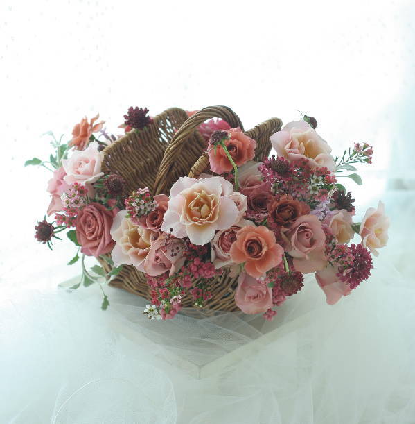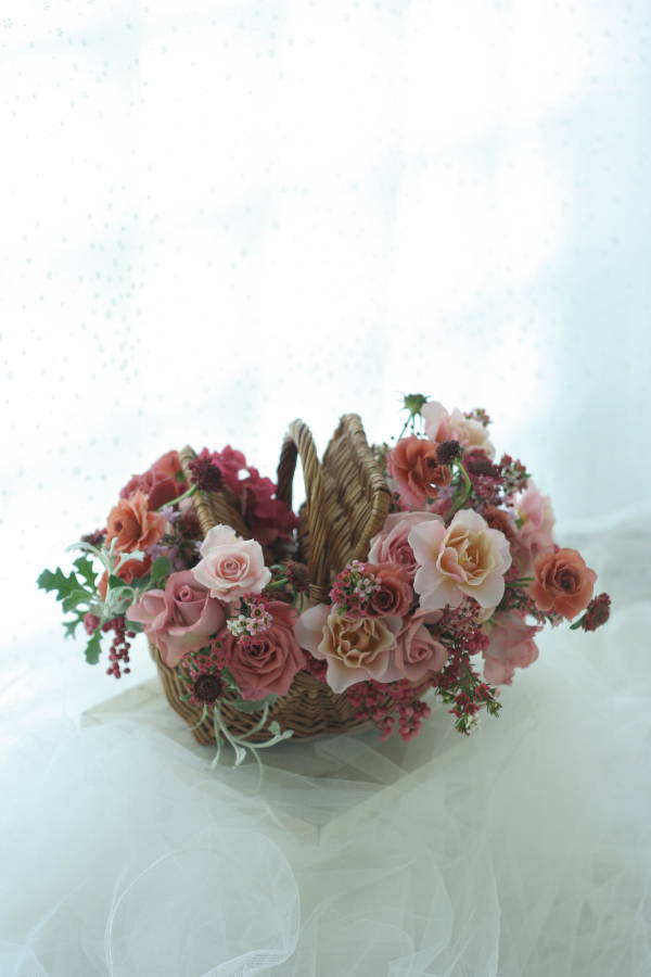 お色直しは、セピアピンクのリボンをウェストに巻いて、