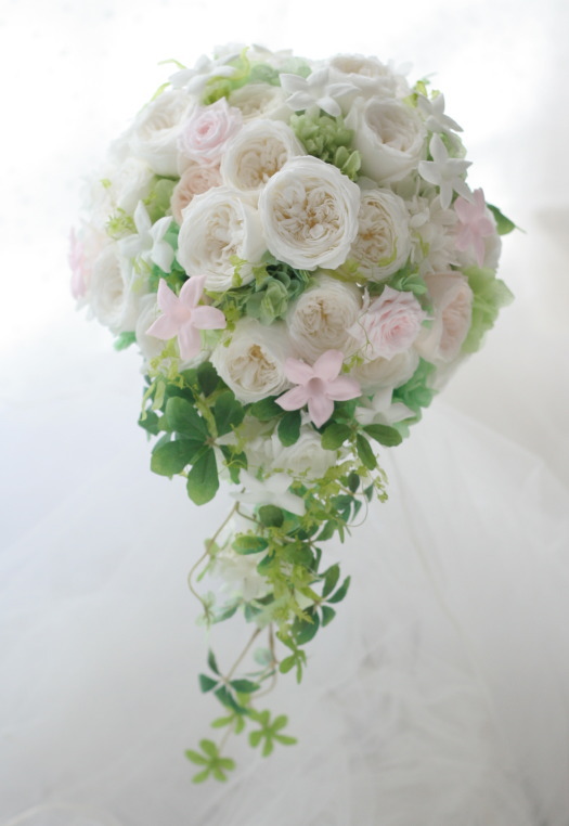 白にほんのり淡いピンクのセミキャスケードブーケ。