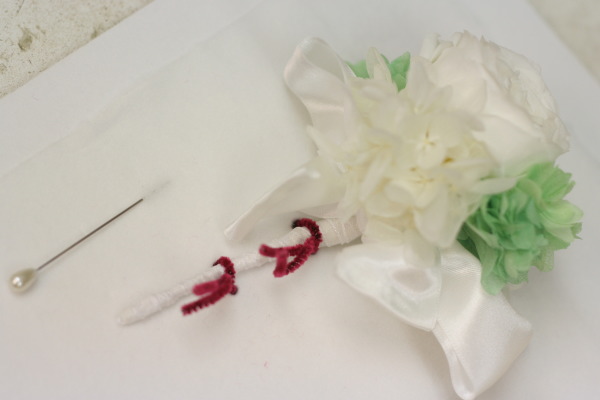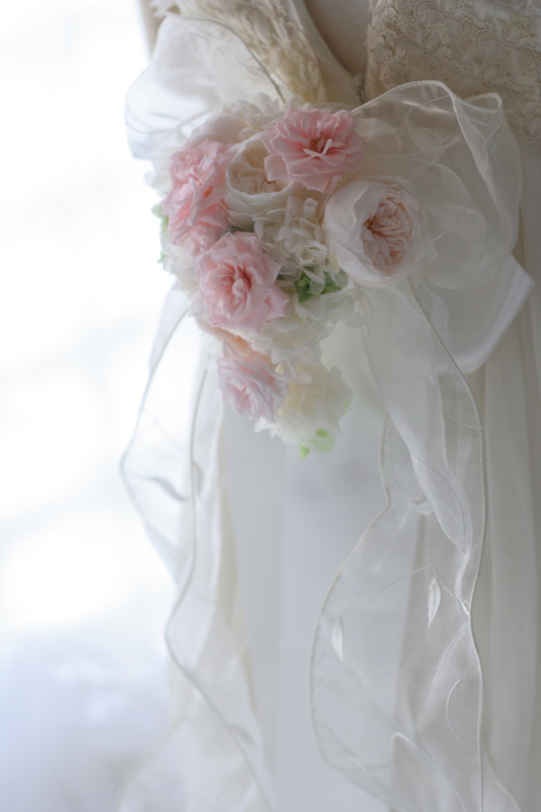 お揃いのバックコサージュは、ちょっとピンク強めで。