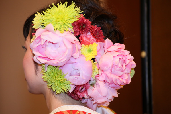 色打掛に大きな芍薬の髪飾りをつけた